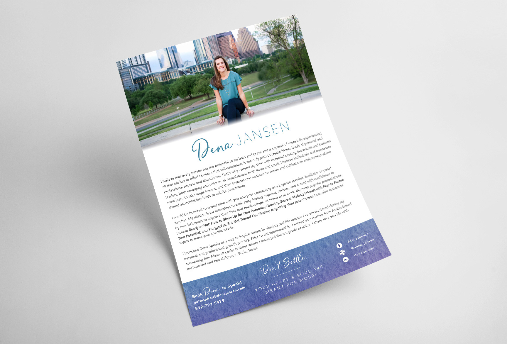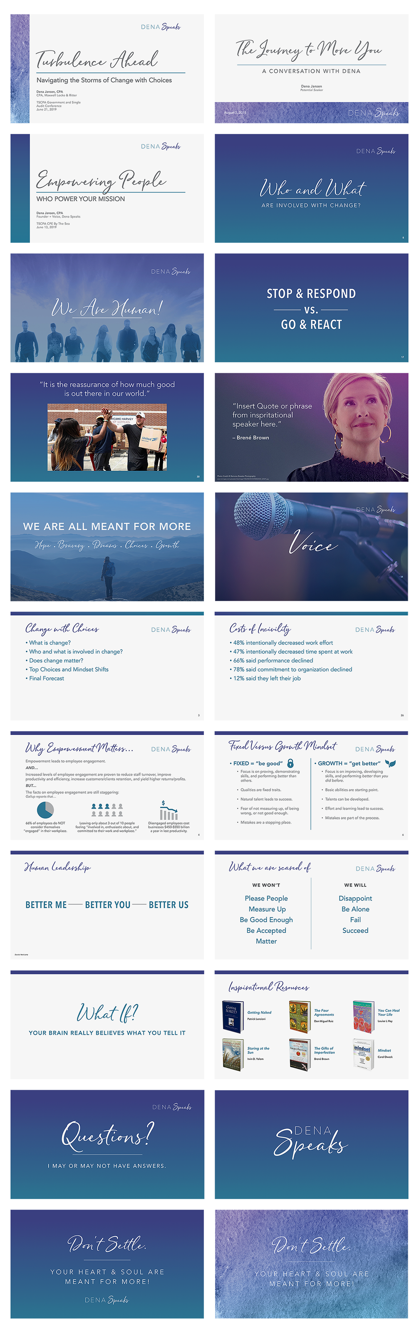 Presentations and other collateral I produced for a motivational speaker based out of Austin, TX. In a creative, approachable, professional, and chic format.