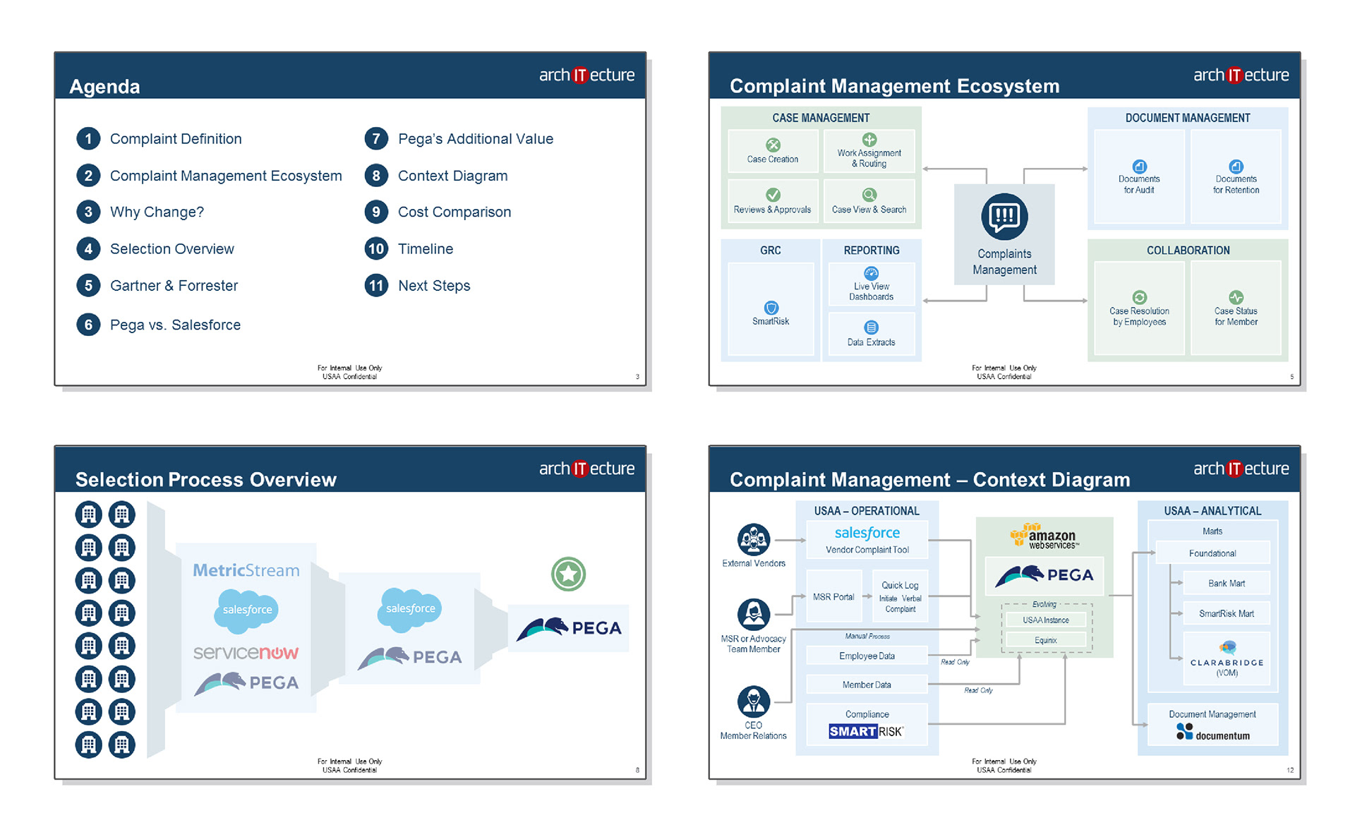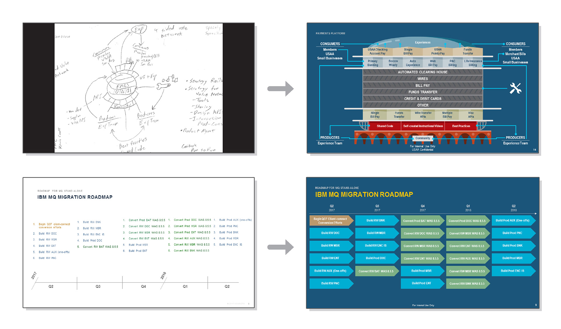 My involvement with IT Architecture Design Services allowed me to produce projects and design solutions that exceeded what clients requested. Most issues were addressed and resolved by team efforts, but when fellow designers were absent or preoccupied, I maintained progress as an individual creative expert. Our mission was to support USAA's Chief Technology Office (CTO) by conveying technical concepts and strategies through compelling design solutions. In so doing, we strengthened and enhanced communication, which led to the adoption of products and services that benefit our members.
